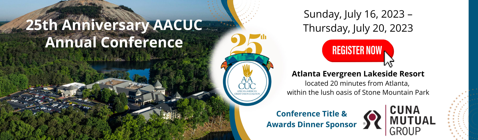 SNELLVILLE, GA – The African-American Credit Union Coalition (AACUC) has partnered with CUNA Mutual Group, a leader in insurance, investment and technology services for credit unions and members, to sponsor the 25th Anniversary AACUC Annual Conference taking place July 16-20, 2023 at the Atlanta Evergreen Lakeside Resort in historic Stone Mountain, GA.